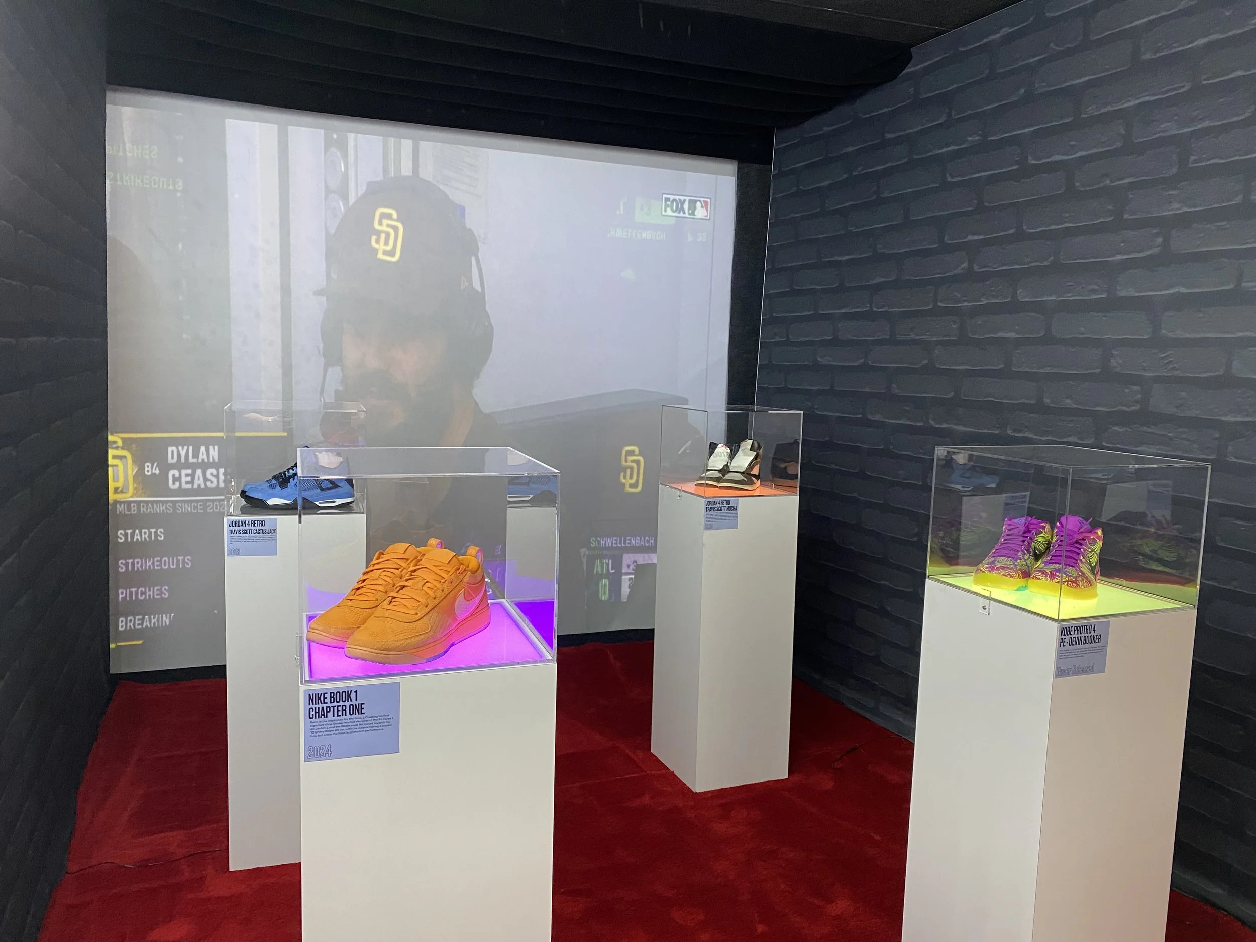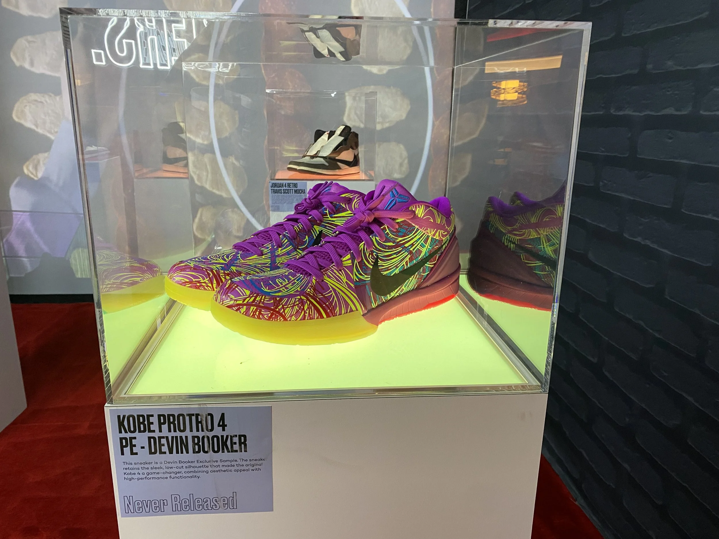 Across from the counter are the last two rooms of the exhibit. The rooms both have red brick walls with red carpet floors. The two rooms are separated by a small section of hardwood flooring. White neon letters are in both rooms. The shoe shine chair must have been used by the boys from Reshoeven8r during the time they were there. The floor to ceiling screen on the far wall plays clips of Bibby during his time in the NBA and during his time at UofA from a projector above your head. The “Exclusive” room had the same wall sized screen but it was playing a Padres baseball game at the time I was there. The Exclusive room had the star of the show in my eyes with the never released Kobe Protro 4 PE – Devin Booker. It’s not the most expensive shoe in the exhibit. Not even close. But the purple and neon yellow hits make it look like it was made for the Schumacher Batman movie